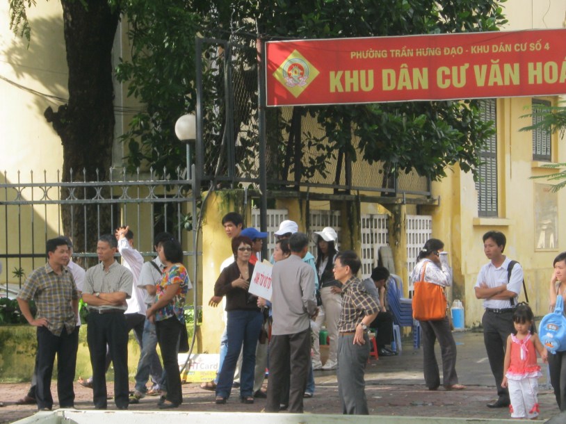 17h55: Hai Pv nước ngoài phỏng vấn Chị Cù Xuân Bích bên hè đường Quán Sứ.