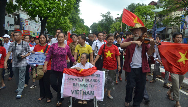Hà Nội: Đoàn biểu tình mỗi lúc một đông, vừa đi vừa hô vang những khẩu hiệu yêu nước.