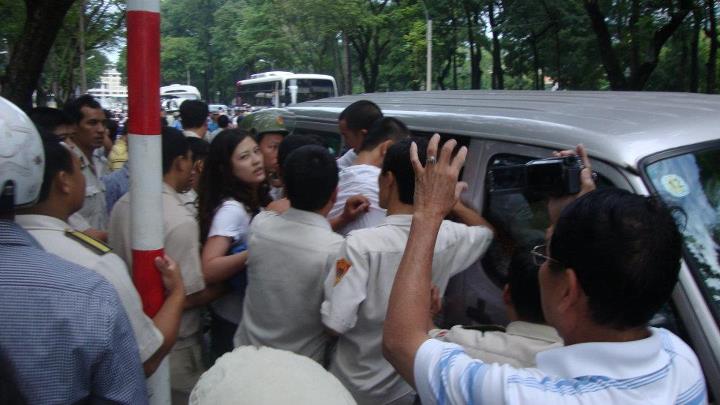 9h15′ – Trời Hà Nội bỗng nhiên hửng nắng như không muốn phụ lòng người yêu nước. Đoàn biểu tình bắt đầu tiến vào đường Tràng Thi. Cả rừng người như sóng trào trong tiếng hô vang: “Hoàng Sa – Trường Sa là của Việt Nam”. 9h30′ - Đoàn biểu tình đã tới Cửa Nam. Số người tham gia biểu tình tiếp tục tăng nhanh. Có khoảng 500 người đang cùng tham gia tuần hành. Tại Sài Gòn, Đoàn biểu tình đã đến rất gần LSQ Trung Quốc, tuy nhiên đã bị hàng rào lực lượng an ninh dày đặc ngăn chặn. Mọi người quay trở lại công viên 30/04. 9h50‘ – Đoàn biểu tình đang tập trung tại Công viên Lê-nin gần Đại sứ quán Trung Quốc. Con số ước tính khoảng 2000 người. 10h00′ – Lực lượng cành sát dày đặc đã ngăn chặn đoàn biểu tình không cho đoàn tiếp cận Đại sứ quán Trung Cộng. Đoàn biểu tình bắt đầu quay đầu tiến về Bờ Hồ Hoàn Kiếm theo phố Hàng Bông. Mọi người tiếp tục hô vang: “Hoàng Sa – Trường Sa là của Việt Nam. Tại Sài Gòn, đoàn biểu tình đang tụ họp tại Công viên 30/4. Công an Sài Gòn tiếp tục giở trò “đánh lén”, “bắt nguội” những người yêu nước. Nhiều bạn trẻ và các Blogger bị chặn đường không cho tiếp cận đoàn biểu tình. 10h15′ – Đoàn biểu tình đang trên đường Hàng Gai tiến về Bờ Hồ. Số lượng người tham gia đang tiếp tục tăng nhanh. 10h30′ – Đoàn biểu tình tới chân tượng Đài cảm tử và giải tán. Blogger Huỳnh Thục Vy bị bắt giữ (ảnh Truyền Thông Cứu Thế)Tại Sài Gòn, tình trạng bắt bớ diễn ra khốc liệt hơn. Theo ghi nhận, tổng cộng có 6 bạn trẻ bị bắt là Blogger Nguyễn Hoàng Vi, Hành Nhân, Gió Lang Thang, Dân Nước Nam, Lê Thuận và bạn Võ Thị Ngọc Châu