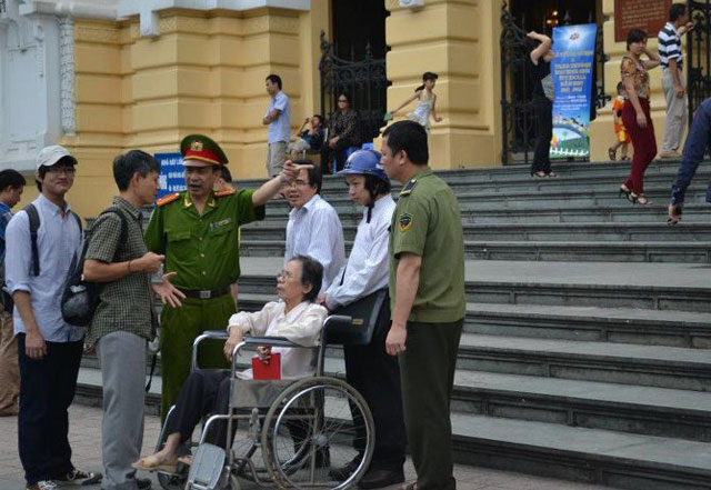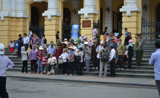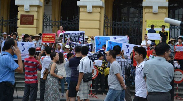 Trong đoàn biểu tình trước Nhà Hát Lớn có bác sĩ Phạm Hồng Sơn, Luật sư Lê Quốc Quân, bà Lê Hiền Đức... và rất đông bà con nông dân các nơi đổ về.