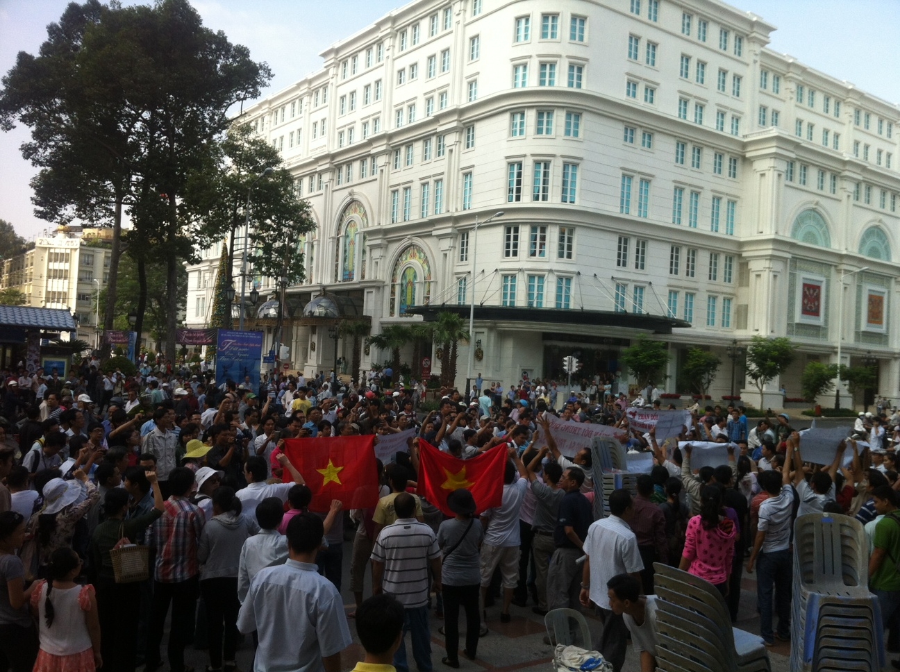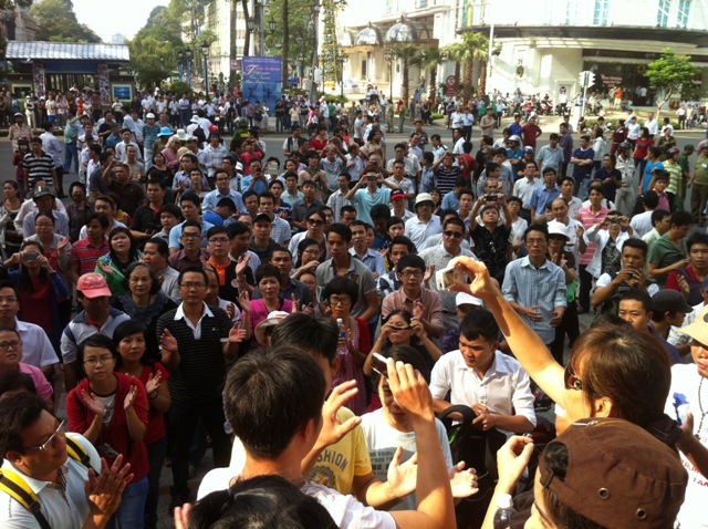 Hàng trăm người đã xuống đường hô to các khẩu hiệu khẳng định chủ quyền của Việt Nam tại hai quần đảo Trường Sa và Hoàng Sa, đảo hiện do Trung Quốc chiếm giữ toàn bộ. Biểu tình diễn ra bất chấp chuyện công an đã đóng chốt tại nhà của nhiều người ở cả hai thành phố nhằm ngăn họ tham gia. Một số người ra được khỏi nhà cũng bị quấy rối hoặc bắt về công an phường. Ông Hồ Ngọc Nhuận, Phó chủ tịch Ủy ban Mặt trận Tổ quốc tại thành phố Hồ Chí Minh nói có tới "hàng chục" công an bao quanh nhà ông khiến ông không thể tham gia biểu tình. Nhưng ông nói chính quyền "đã thất bại" vì hai cuộc biểu tình vẫn diễn ra bất chấp chuyện họ đã dùng mọi biện pháp để ngăn cản. Một ngày trước khi biểu tình diễn ra, ông Nhuận đã có tuyên bố kêu gọi chính quyền đứng về phía người dân. 'Lửa nhỏ, cháy to'Giải thích vì sao chính quyền không để cho người dân xuống đường phản đối hành động "cắt cáp" tàu thăm dò dầu khí hay in bản đồ hình "lưỡi bò" lên hộ chiếu của Bắc Kinh, ông Nhuận nói: "Tại vì họ sợ dân thôi, bởi vì họ quá là bậy về tất cả mọi phương diện. "Một cái chế độ mà nó hư nát về mọi phương diện từ nhiều năm qua rồi thì một mặt họ vì quyền lợi riêng tư của họ, phe nhóm của họ. "Thứ hai là họ chạy theo đuôi nước ngoài, đặt biệt là Trung Quốc, cũng vì quyền lợi của họ. "Họ biết rõ lòng tin của nhân dân gần như không còn nữa nhưng mà họ còn những guồng máy cai trị, guồng máy đàn áp thì họ sử dụng những guồng máy đó. "Và những guồng máy đó họ cũng vì quyền lợi của họ mà họ phải bám theo.. "Cái vấn đề chính là họ không tin dân, họ sợ dân thế thôi. "Họ biết rằng chỉ cần một nhúm lửa nhỏ nó có thể bùng thành một đám cháy to và đám cháy to thì họ không còn quyền hành nữa, họ sẽ bị lật đổ." 'Âm mưu xảo quyệt'Ông Nhuận nói chính quyền đã có những hành động mà ông gọi là "hèn nhát" khi trấn áp người biểu tình và cáo buộc các lãnh đạo Việt Nam "tiếp tay" cho Trung Quốc: "Nhà cầm quyền Bắc Kinh nó muốn thao túng, nó muốn thôn tính đất nước này.  Việt Nam đã nhanh chóng dập tắt biểu tình hôm 9/12 "Mà nhà cầm quyền này đương phụ họa, chống chúng tôi ...tức là tiếp tay cho những âm mưu xảo quyệt của Bắc Kinh. "Cái điều mà chúng tôi không thể chấp nhận được là chính quyền này có thể đàn áp nhân dân trong khi nhân dân chỉ chống Trung Quốc thôi." Ông Nhuận nói nhiều trong số những người phản đối chính quyền đã từng tham gia cuộc chiến biên giới chống Trung Quốc hồi năm 1979 và cả cuộc chiến chống Mỹ kết thúc năm 1975. Vị Phó chủ tịch Mặt trân Tổ quốc bác bỏ cách giải thích của chính quyền rằng các cuộc biểu tình có thể bị những "kẻ xấu" lợi dụng: "Kẻ xấu đó chính là những kẻ đang bụm miệng chúng tôi chứ còn kẻ xấu nào nữa. "Dân càng ngày càng bất mãn và càng muốn có sự thay đổi và càng muốn họ [chính quyền] quay đầu lại với lẽ phải... "Họ [nhân dân] muốn cho chình quyền trong sạch, tốt và hòa đồng với nhân dân chứ ai muốn lật đổ họ..." 'Ngoài sức tưởng tượng'Một trong những người thoát lưới của công an và tới Nhà hát Lớn ở thành phố Hồ Chí Minh là ông Huỳnh Tấn Mẫm, người 40 năm trước từng xuống đường đòi Mỹ rút quân khỏi Việt Nam. Ông Mẫm kể: "Hồi năm 1969 khi tôi được bầu là Chủ tịch Tổng hội sinh viên thì phát động phong trào đòi dân sinh dân chủ, đòi hòa bình. "Trong phong trào đó nổi lên một số phong trào lớn và rất nhiều phong trào khác, nhưng phải nói là trong các cuộc đấu tranh như vậy, sinh viên học sinh có tổn thất dữ lắm. "Nói chung là tra tấn đánh đập đủ hết, mọi cực hình nói chung là ngoài sức tưởng tượng của anh chị em sinh viên thời đó. So sánh hành động của chính quyền Sài Gòn trước đây và giới chức hiện nay, ông Mẫm nói: "Hồi đó ác liệt hơn, ác liệt hơn nhiều, bởi vì là giữa một bên đòi dân sinh dân chủ, đòi Mỹ rút quân, thì đó là cái mục tiêu rất lớn, nên chính quyền Sài Gòn chắc chắn là phải đàn áp. "Với cả cũng khác là vì nó nằm ở thủ đô, trung tâm Sài Gòn, lúc đó thì Sài Gòn là một thủ đô, không phải là một tỉnh, một thành, cho nên là nằm giữa Sài Gòn thì chính quyền Sài Gòn nó phải dùng những biện pháp để mà giữ vững ổn định an ninh ở trong Sài Gòn." 'Trắng trợn, ngang tàng'Ông Huỳnh Tấn Mẫm cũng giải thích ông tham gia kêu gọi biểu tình chống Trung Quốc do rất bức xúc trước âm mưu "thâm độc và lâu dài" muốn chiếm biển Đông, và việc nhà nước Trung Quốc làm người dân "hiểu lầm" rằng, Hoàng Sa Trường Sa là của người Trung Quốc. Ông nói: "Trung Quốc trước đây từng là bạn của Việt Nam, từng cứu trợ Việt Nam, thế mà bây giờ quay lưng lại, muốn đi chiếm Biển Đông. "Chúng tôi cho đây là hành động trắng trợn, ngang tàng, bất chấp dư luận trong nước và thế giới. "
